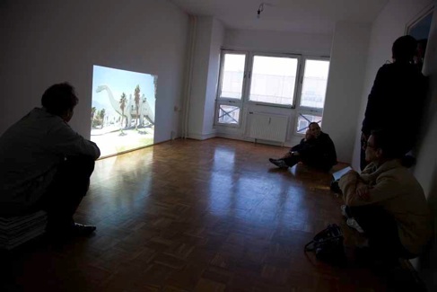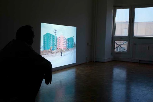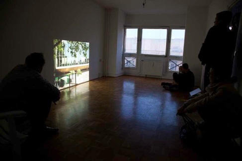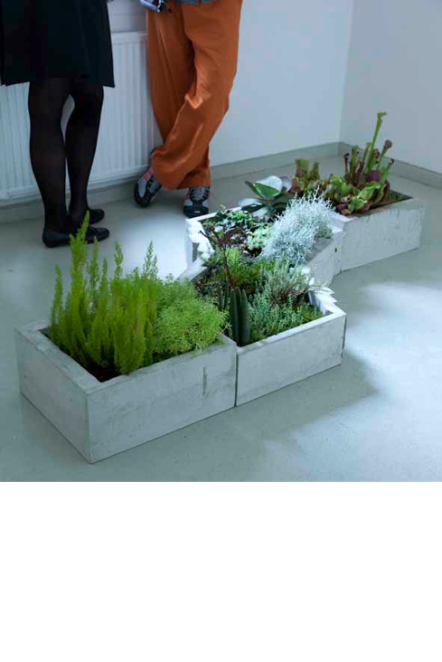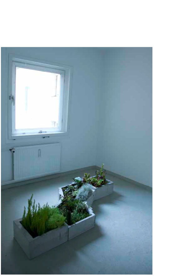 Für die Ausstellung mit Arno Brandlhuber hat Isa Melsheimer ein dreiteiliges Betonobjekt entwickelt, das als Pflanzkübel fungiert und dessen Elemente sich prinzipiell zu einem Kreis multiplizieren liessen. Das Objekt nimmt Bezug auf das Baumaterial des 1989 fertiggestellten Plattenbaus, in dem die Bibliothekswohnung liegt. Zudem stellt die Skulptur eine Verbindung zu den Blumentöpfen her, die vom Fenster aus im Hof und auf einem Flachdach zu sehen sind. Darüber hinaus haben Isa Melsheimer und Arno Brandlhuber Pflanztöpfe aus Beton in aller Welt gefunden und für ihr wachsenden Bildarchiv interessanter Architekturen fotografiert. Für die Ausstellung in der Bibliothekswohnung haben sie zum ersten Mal ihre Bildarchive in einer Projektionsabfolge zusammengefügt. Neben einigen Betonkübeln sind vor allem Häuser zu sehen, die das formale Interesse der Künstlerin und des Architekten weckten: Bauikonen wie die von Adalberto Libera gebaute Villa Malaparte, Le Corbusiers Villa Savoye oder das Privathaus von Lina Bo Bardi, aber auch von weniger bekannten Architekten entworfene Gebäude in Kasachstans Haupstadt Astana, Hinterhöfe in Kreuzberg und Isa Melsheimers Motivsammlungen von auf Felsen gebauten Häusern, Ruinen und Gebäude-Katastrophen. Ergänzend stellen Isa Melsheimer und Arno Brandlhuber aus ihrer gemeinsamen Bibliothek einen Bücherstapel zur Verfügung, der die Besucher einlädt, das Thema Beton weiter zu ergründen.