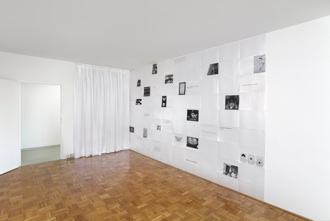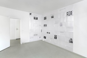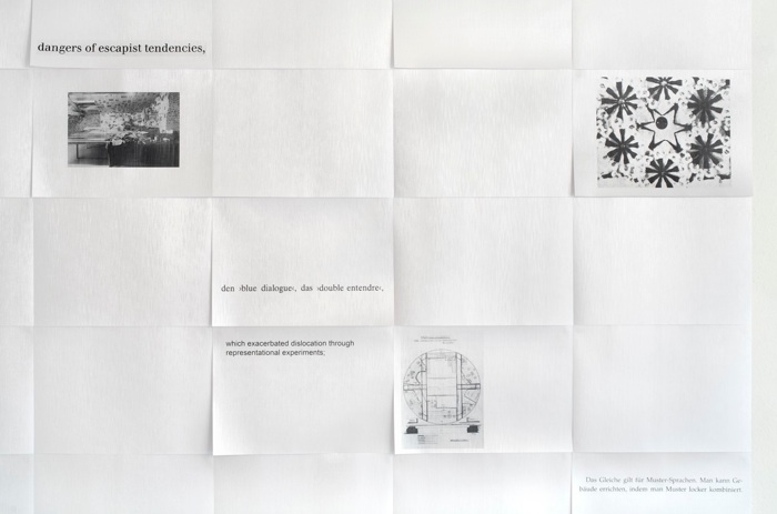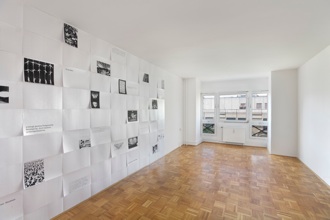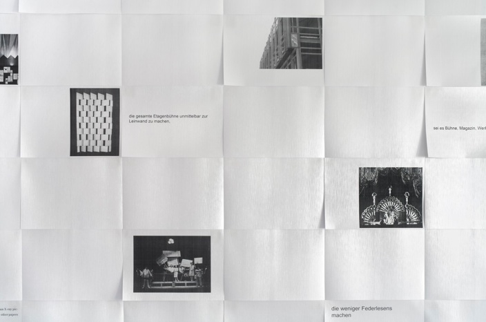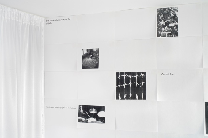 A glance through the window shows Friedrichstadtpalast, Europe’s largest Revue theatre: Rebuild in the 1980s by the GDR government as prefabricated High-Rise the façade recreates Art Deco ornaments. By using found images and text fragments Mayer’s installation for Bibliothekswohnung revolves around the changeable history of the building and prefabricated high-rise architecture, discussing questions deriving from theatre history and revue, as well as art historic issues of staging and display.
