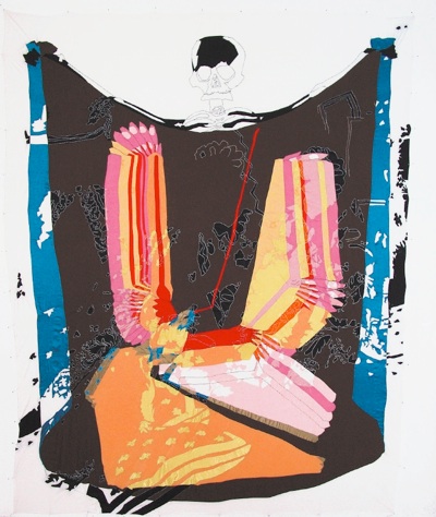 Ruth May’s large-scale fabric-based pieces display rich textures and complex structures that are reminiscent of Renaissance paintings, combined with iconic elements of popular culture, tattoos and references to 1960s German Pop Art.