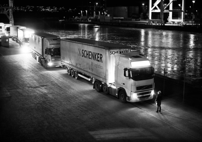 Person obstructing a line of containers. Kaj 3 Frihamnen, Stockholm, Sweden. February 2009 (video still)